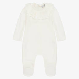 Ivory cotton babygrow for boys and girls by Atelier Choux, with a gorgeous print of animals, such as elephants, sheep and hedgehogs. Made in beautifully soft jersey, it has gold piping and fastens with branded gold poppers on the front and between the legs.