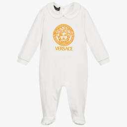 White babygrow by Versace, featuring the luxury Italian label's distinctive embroidered logo patch on the front for instant designer appeal. Made in soft cotton jersey, this comfortable one-piece has easy-to-use poppers on the back, detailed with the iconic Medusa head for a stylish finish.