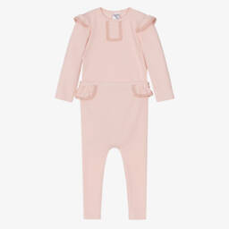 Girls beige ribbed leggings set by Jamiks offers a charming blend of comfort and style. Made from soft cotton jersey, the long-sleeved bodyvest features easy popper fastenings and delicate ruffle trims edged with lace. The leggings include a gently elasticated waistband, providing a snug fit. Suitable for everyday wear, this delightful set is available in limited quantities, making it a last chance to buy for those seeking both practicality and elegance.
