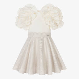Girls blue cotton floral dress by Jessie and James London is exclusive to Childrensalon. This classic design features a soft cotton twill bodice with voluminous ruffles on the sleeves, creating a distinctive silhouette. The full skirt, woven with an ornamental jacquard floral design, is comfortably lined with lightweight cotton voile. A concealed zip and amber-coloured button fastening at the back ensure easy wear. Limited quantities available.