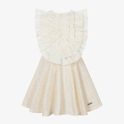 Girls ivory and blue floral dress by Jessie and James London is perfect for a special occasion. Crafted from soft cotton, the sleeveless bodice features exquisite layered ruffles, while the full, circular skirt showcases a beautiful blue floral jacquard design. Lined in lightweight cotton for added comfort, it includes a concealed zip and an amber-coloured button fastening on the back. Limited quantities available, don't miss your last chance to buy.