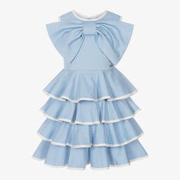The girls ivory and navy blue bow dress by Jessie and James London is crafted from a soft cotton and viscose blend. The sleeveless ivory bodice features an oversized bow with a logo tag on the waistband. The navy blue skirt has beautiful ruffled tiers with contrast trims and a voile lining. It has a concealed zip fastening on the back and an amber button on the skirt overwrap. Last chance to buy, with limited quantities available.