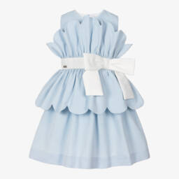 Girls yellow scallop dress by Jessie and James London features a delightful patterned jacquard weave perfect for special occasions. This sleeveless dress is adorned with charming scalloped ruffles and an elegant ivory waistband with a bow accent. The lightweight cotton voile lining ensures comfort, while a concealed zip at the back provides easy fastening. A subtle logo tab adds a touch of brand finesse. Limited quantities are available, making it a last chance to buy this exquisite piece.