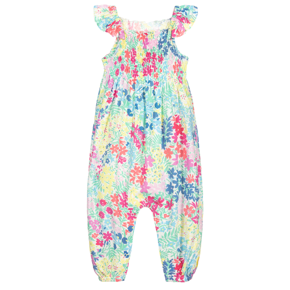 A delightfully pretty playsuit for baby girls by British brand Joules. Made in lightweight viscose, it has a colourful floral print and soft ruching on the bodice. The shoulder straps are gently elasticated and have ruffled trim. The ankle cuffs are also elasticated.