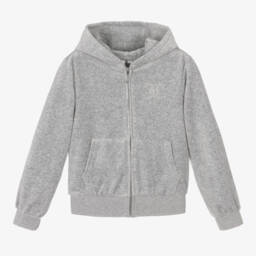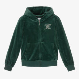 Bright blue zip-up hoodie for girls, by iconic brand Juicy Couture. Made in the designer's signature soft velour, it has a sparkling gold diamanté logo on the chest for added glamour. A statement diamanté appliqué can be found on the back for an instantly recognisable look.