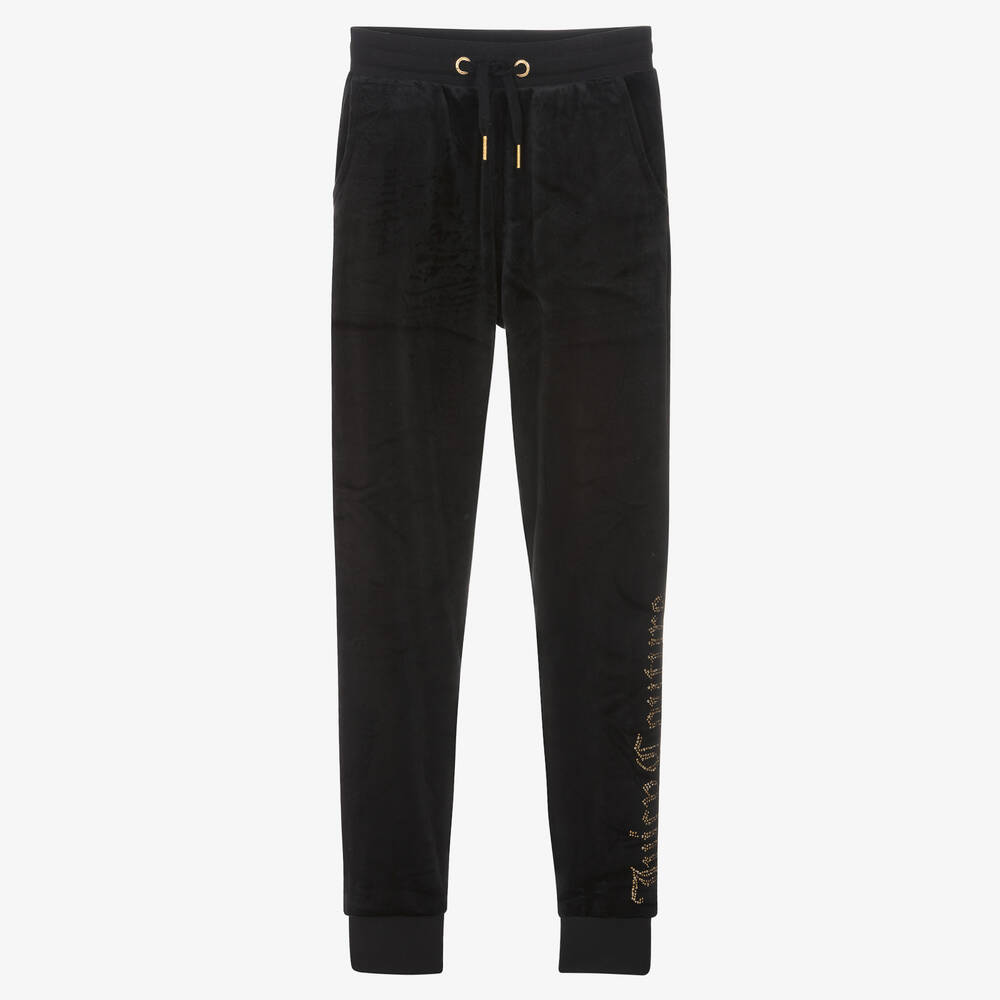 Black velour joggers for teen girls by loungewear brand, Juicy Couture. This stylish, casual piece has pockets on both the front and back and a comfortable drawstring waist. The brand's logo is appliquéd on one leg in gold diamantés for a sparkling designer finish.
