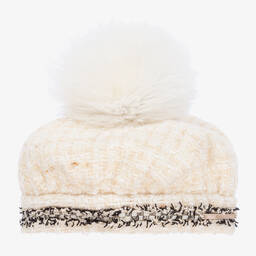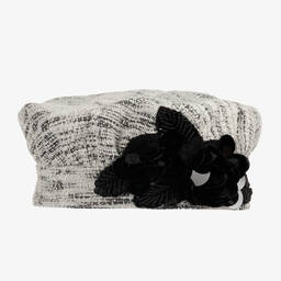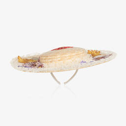 The girls beige straw hat by Junona features a beautifully woven design, perfect for special occasions. Its shallow crown and wide brim are adorned with delicate blue tulle and floral chiffon ruffles, complemented by large floral appliqués. A satin-covered hairband and blue lace ties ensure a secure and comfortable fit. This unique piece creates an elegant look and is available in limited quantities, making it a splendid choice for spring and summer events.