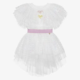 The girls white sequin and feather dress by Junona is a stunning choice for special occasions. Crafted from lightweight tulle, it features silver sequins, beads, and delicate turkey feathers. The dress boasts a full trapeze style with sheer long sleeves and a soft cotton lining for comfort. An elegant organza collar and a concealed zip at the back enhance its sophisticated appeal. Limited quantities available, making it a unique addition to any wardrobe.