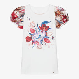 Pretty ivory T-shirt for girls by Junona, made in soft cotton jersey. The front is decorated with a lilac purple and pink floral butterfly, with an oversized pink and yellow organza flower appliqué standing out from the look. It has a shiny gold logo embossed charm sewn near the hem for a discreet, designer detail and flutter sleeves for a girly style.