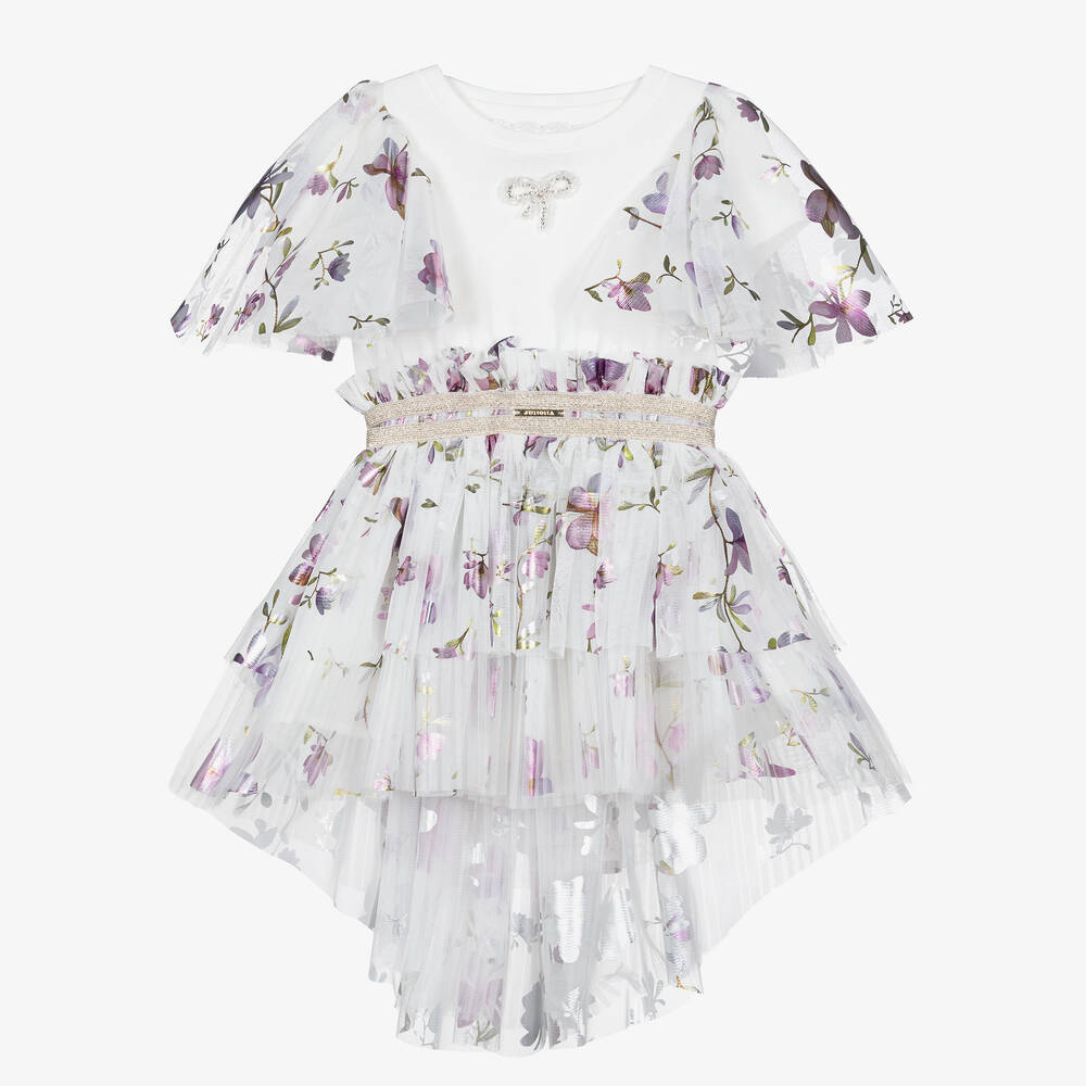 Exclusive to Childrensalon, this gorgeous white dress for girls is by Bulgarian brand Junona. The cotton jersey bodice has a beaded diamanté bow on the front, with gorgeous tulle trimmed sleeves. Made in cascading layers of tulle, the waterfall skirt is decorated with purple foil flowers, and has a glittery elasticated waistband with a gold charm logo on the front. This dress is lined in soft cotton voile for comfort.