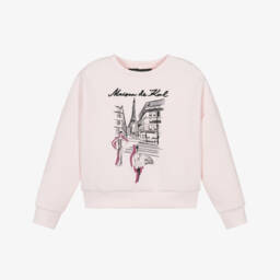 Pink boxy sweatshirt for girls by KARL LAGERFELD KIDS. It has the designer's beloved Choupette printed in shiny gold on the front, inspired by the NFT KARL LAGERFELD Collection. It is made in super soft viscose blend jersey with dropped shoulders for a casual look. There is a further gold logo print on the back of the neck.