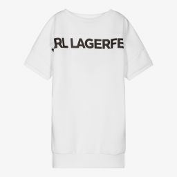 Stylish black short-sleeved sweatshirt dress for teen girls by KARL LAGERFELD KIDS, made in a viscose blend jersey. It is printed with the designer's logo on the front and back in white and has unique batwing style sleeves. It has useful side pockets and has a contemporary shape that tapers towards the hem.