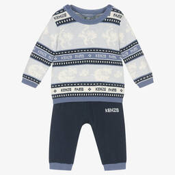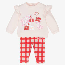 White top and rose pink trouser set for baby girls by KENZO KIDS, made in soft organic cotton jersey. The top has a Kenzo logo print in pink on the front and popper fastenings on the shoulders. The sweatshirt jersey joggers have the Tiger & Friends logo embroidered on the front, an elasticated waist and cotton jersey lining for comfort.