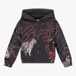 Dark grey, hooded zip-up top for boys by KENZO KIDS, made in soft cotton sweatshirt jersey. It has the designer's Multi Iconics print in black, red, white and grey, with embroidered detail. The top has concealed side pockets and ribbed trims.