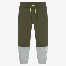 Dark ivory joggers for boys from KENZO KIDS, made in cotton sweatshirt jersey with a colourful slubbed effect. They have elasticated cuffs and a useful drawstring waistband. Both legs are printed with green, blue and yellow multi iconic motifs, the brand's logo and the iconic Elephant logo printed on one side. There are pockets on the side seams.