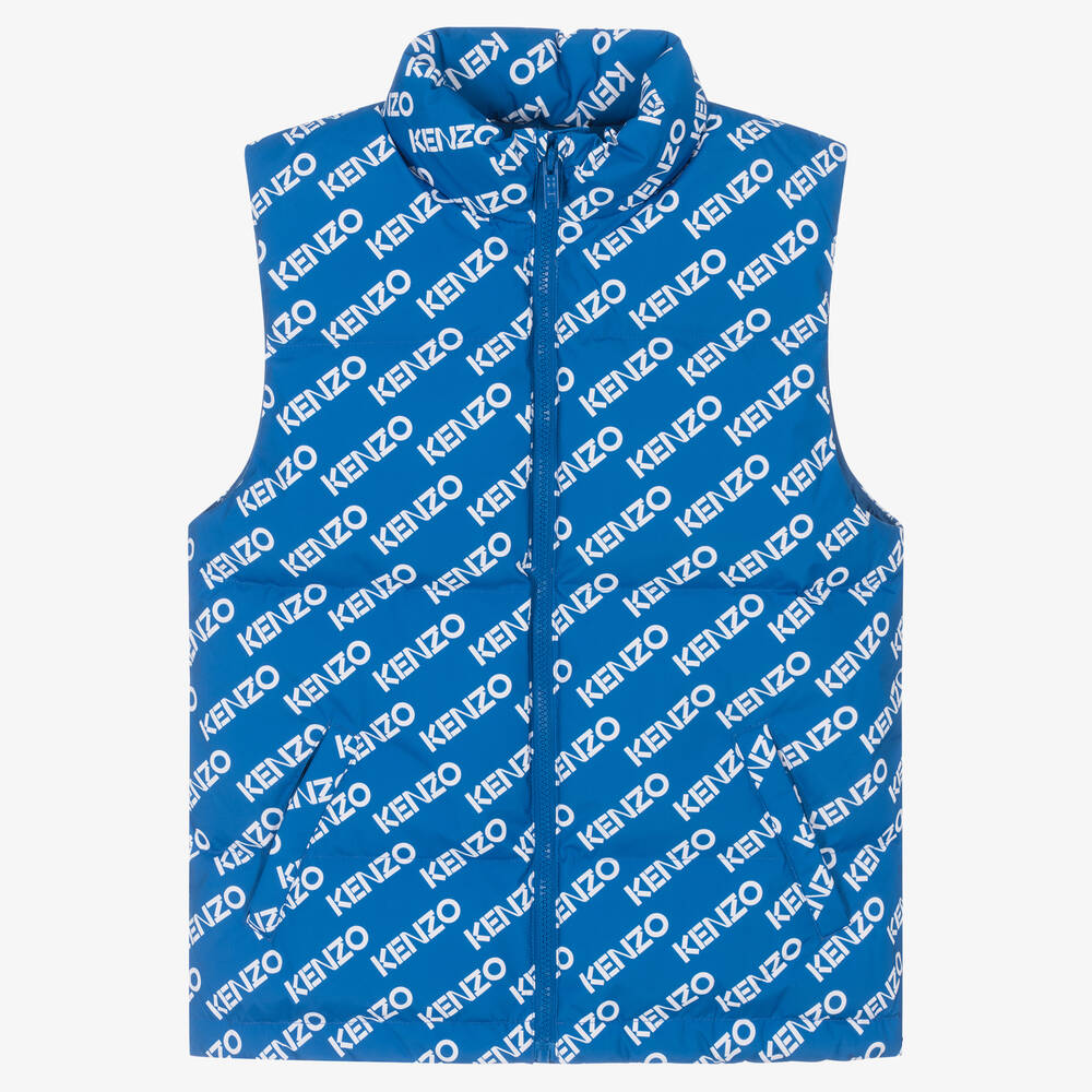 For teen boys and girls, a blue puffer gilet by KENZO KIDS, with the brand's signature logo pattern in white. Down padded for superior warmth, it has a luxurious silky smooth feel, useful front pockets and an exposed zip fastening with a branded pull.