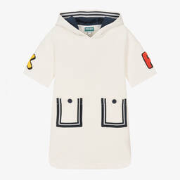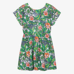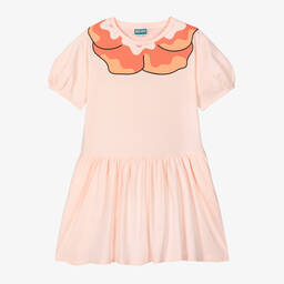 Teen girls ivory floral dress by KENZO KIDS features a soft, woven cotton fabric with pink and green florals, enhanced by black script branding. The front popper closures and elasticated waist provide comfort and a stylish fit. Short sleeves and side pockets add practicality to this chic piece. Limited quantities available, last chance to buy!