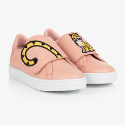 White leather trainers for boys and girls by KENZO KIDS, with the designer's fun embroidered KOTORA tiger and tail on the wide velcro-fastening straps. There is a black logo print on the back of the padded heel and a tonal embossed logo on the back of the non-slip rubber outer soles for added designer detailing. They have a soft lining, lightly padded inner soles for comfort and non-slip soles patterned with the brand's Tiger, Elephant and logos, as well as jungle leaves.