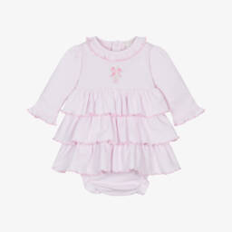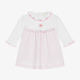 The girls white pink heart dress by Kissy Kissy is a charming addition to any wardrobe. Made from beautifully soft Pima cotton jersey, this dress features a delightful red and pink heart print, delicate red picot trim on the neckline, and sweet ruffle sleeves. Easy popper fastenings on the back and attached body vest make changing effortless. Limited quantities available, so it's your last chance to buy this adorable dress.