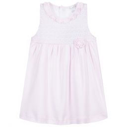 Sweet pale pink dress for baby girls by Kissy Kissy. Made in soft Pima cotton jersey for babies delicate skin, it has white embroidered picot trims with cute white bunnies embroidered on the bodice. Fastening with poppers on the back, it has flutter sleeves and a pretty ruffle trim on the skirt. It comes with matching elasticated knickers to co-ordinate the cute look.