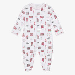 Boys white babygrow features a delightful car pattern, crafted in luxurious Pima cotton by Kissy Kissy. The super soft jersey offers ultimate comfort, while the easy zip fastening with a protective chin guard ensures practicality. Fold-over scratch mitts are included in sizes up to three months, making it perfect for gentle skin. Ideal for spring and summer wear, this charming outfit is a must-have in limited quantities—secure yours now.