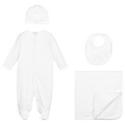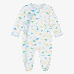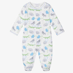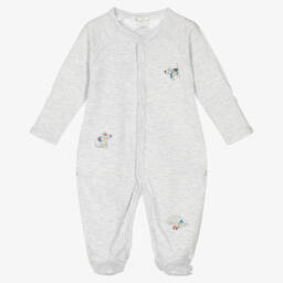 Sweet red festive babygrow for baby boys and girls by Kissy Kissy, made in luxuriously soft Pima cotton. It has a pretty white ruffle collar with red picot trims and a beautifully hand-smocked panel on the front with hand-embroidered Christmas trees. It fastens on the back and between the legs with easy-to-use poppers.