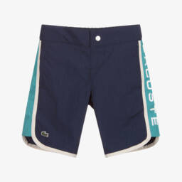 Blue swim shorts for boys by French brand Lacoste. Made in silky smooth and lightweight recycled fabric, they have side seam pockets and a useful drawstring waist. The signature embroidered crocodile logo patch is on one leg for a statement branded finish.