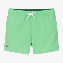Boys green swim shorts by Lacoste are crafted from silky smooth and lightweight recycled fabric. Featuring side seam pockets and a useful drawstring waist, these shorts are completed with the signature embroidered crocodile logo patch on one leg, ensuring a stylish, branded look. Perfect for summer fun, these swim shorts offer practical comfort for young adventurers. Limited quantities available – last chance to buy!