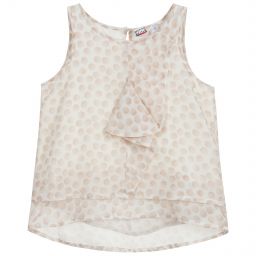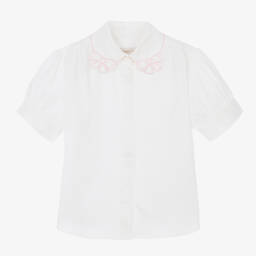 The girls ivory sequin bow top by Lanvin is crafted from soft, smooth cotton poplin, featuring an elegant A-line silhouette and charming puffed sleeves. This exquisite blouse features a striking pink sequin bow on the front and a subtle embroidered logo at the back, fastened with concealed buttons and iconic Arpège buttons on the cuffs and neck. Suitable for special occasions, this top offers both style and comfort. Limited quantities available.