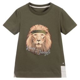 Boys blue jersey T-shirt by Lapin House, with a beige 'King of the Jungle' lion print. The smaller sizes have shoulder poppers.