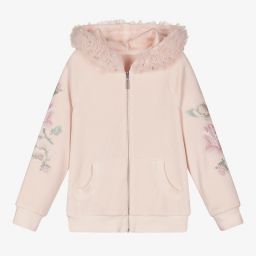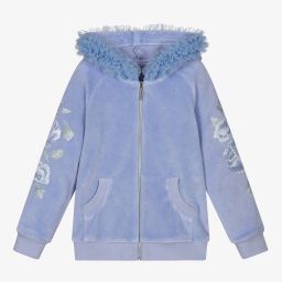 In a lovely shade of cornflower blue, a hooded zip-up top for girls from Lapin House. Made in soft cotton velour, it has ruffled tulle trim on the hood, blue floral print on the sleeves, and front pouch pockets.