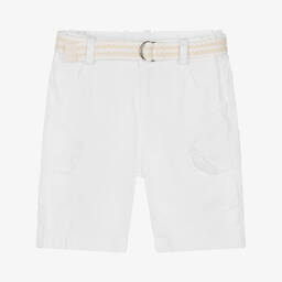 Casual navy blue cotton cargo shorts for boys by Lapin House, just right for relaxed days. Made in lightweight twill with a slight stretch, they have useful jetted front pockets and cargo pockets on the legs. They have a detachable, woven, webbed belt in ivory, navy blue and beige and an adjustable waist for a good fit. There is a logo button fastening on the front and a zip.