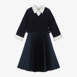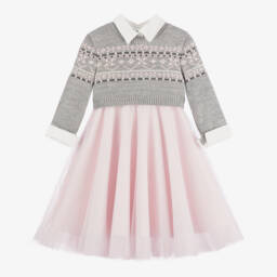 Girls black and ivory dress set by Lapin House offers charming elegance with its jersey bodice and woven houndstooth skirt. The dress features a short button placket and a flared silhouette, complemented by an ivory sweater with a Scottie dog motif. Crafted for warmth and style, this set is lovely for autumn outings. Limited quantities available, offering a unique addition to any wardrobe.