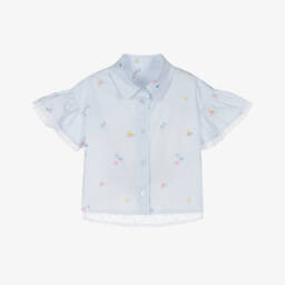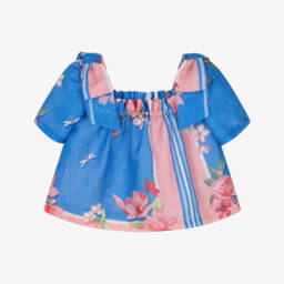 The girls blue bow strap top by Lapin House is crafted in soft cotton seersucker, ideal for warm spring and summer days. This charming sleeveless design features a striking bow on the front, complemented by wide ivory straps adorned with pastel floral prints and delicate lace trim. Lightweight and breathable, it ensures comfort while adding a touch of elegance. Limited quantities available, making it a perfect choice for a stylish wardrobe addition.
