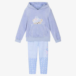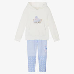 Ivory hoodie and leggings set for girls by Lapin House. The hoodie is made in soft cotton velour, with a patch pocket on the front and a cute print of a bear in a bobble hat, with a sparkly diamanté trim. In cornflower blue, the long cotton jersey leggings have an all-over knitted pattern, with pretty jewel and teddy charm prints and a comfortable elasticated waistband.