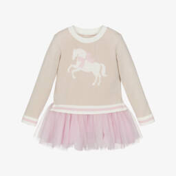 Girls black and ivory dress set by Lapin House offers charming elegance with its jersey bodice and woven houndstooth skirt. The dress features a short button placket and a flared silhouette, complemented by an ivory sweater with a Scottie dog motif. Crafted for warmth and style, this set is lovely for autumn outings. Limited quantities available, offering a unique addition to any wardrobe.