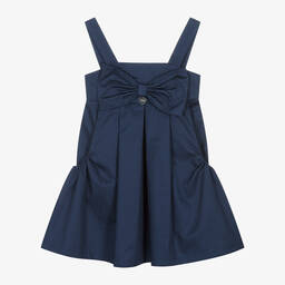 A beautiful pink cotton bow dress for girls by Lapin House features smooth cotton poplin fabric. This stylish dress has a flared silhouette with front pleats and convenient gathered side pockets. The bodice is adorned with a large bow and a silver heart-shaped logo charm, adding a branded touch. Narrow straps and a partially elasticated back ensure a comfortable fit. Limited quantities available.