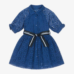 Girls white broderie cotton shirt dress by Lapin House features beautiful broderie anglaise cotton. This feminine shirt dress is styled with a pointed collar, puffed short sleeves that tie at the cuffs, and button fastenings on the front. The gathered skirt and navy blue and grey striped grosgrain ribbon belt with a sparkly logo print add charm. Limited quantities available, so don't miss your last chance to buy this breathable, lightweight dress, perfect for spring and summer.