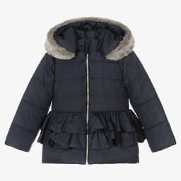 Contemporary white puffer coat for girls by Lapin House, made in a silky tactel fabric. Classically styled, with added feminine touches, this fun coat has a frilly skirted trim and fixed bow on the back. Fastening with a zip, it has a removable faux fur trimmed hood, offering two different looks. It is lined with soft cotton and lightly padded for cosiness.