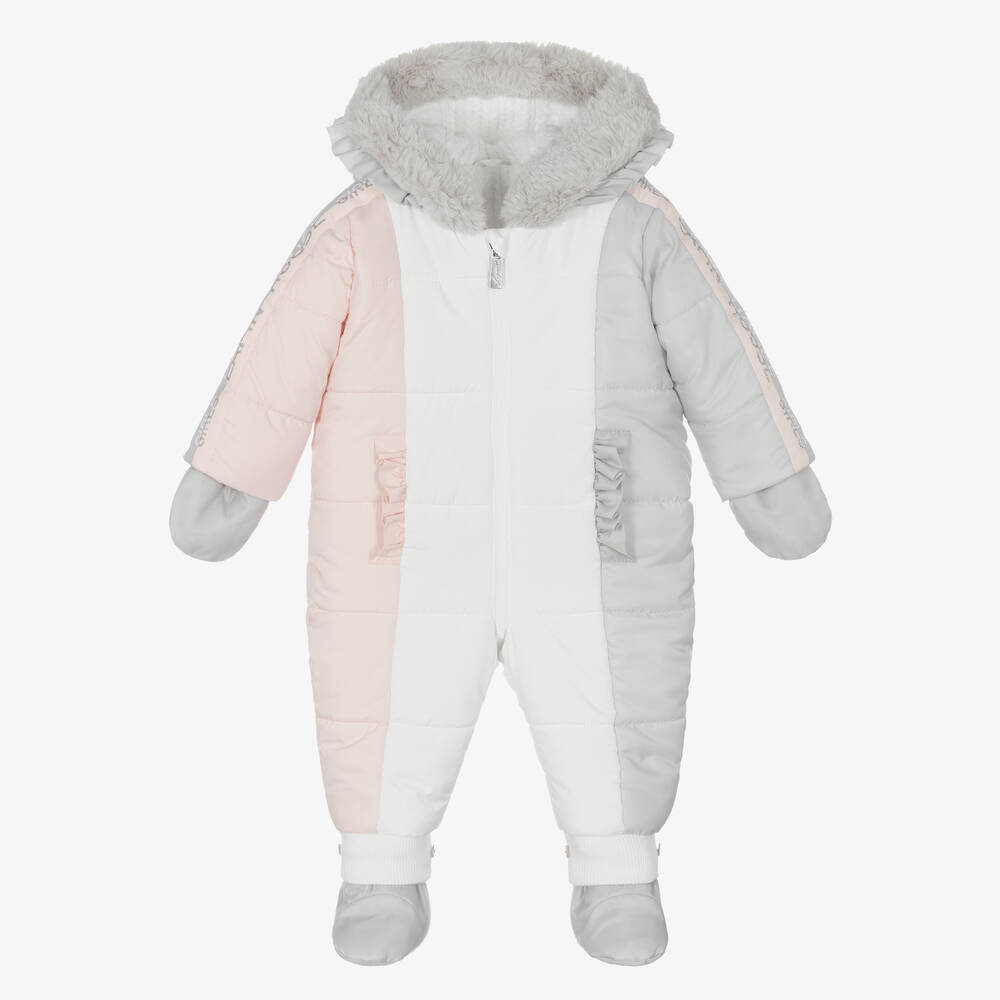 Pink, white and grey snowsuit for baby girls by Lapin House. It is warmly padded and the hood has a soft cable knit jersey lining, with grey faux fur and ruffle trim. There are front pockets with ruffle detail and the snowsuit has branded pink and grey tape along the sleeves, with a white and glittery silver print. It comes with detachable, faux fur trimmed mittens and booties that attach with poppers