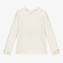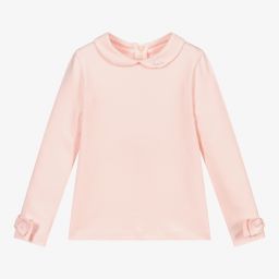 Girls soft, brushed red cotton jersey top by Lapin House. Made in a warmer weight jersey, it has a rounded collar, with a silver logo print and bow details at the cuffs. There is a concealed zip fastening on the back.