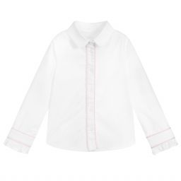 Girls white shirt from Lapin House, with a pretty red velvet trim. It is made in soft, mid-weight cotton, with a slight stretch. The cuffs have ruffle detail and the top button and cuff buttons have diamanté detail.