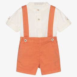 A smart-casual grey-blue shirt and white shorts for baby boys by Laranjinha, The collarless shirt is made in a soft linen and cotton blend, with upper button fastenings. It has an attached cotton jersey bodyvest, fastening with poppers to keep it neatly tucked in. The cotton shorts have detachable shoulder straps and are elasticated at the back for a comfortable fit. They have little front pockets and decorative buttons on the front.