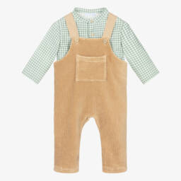 Boys blue striped dungaree set by Laranjinha features charming details that make it a must-have. The soft and lightweight cotton dungarees come with ivory and red adjustable straps and wooden button fastenings. A navy blue patch pocket and matching side tabs add a cute touch. The set includes a navy blue, waffle-textured organic cotton jersey bodysuit with matching buttons, complete with poppers for easy dressing. Limited quantities available, so don't miss out on this adorable ensemble.
