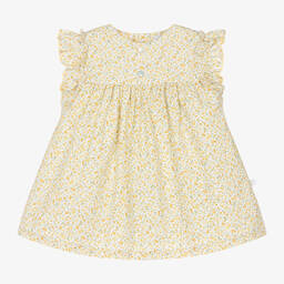 Girls ivory cotton floral dress by Laranjinha is a sweet addition to any little girls wardrobe. Made from soft and lightweight cotton poplin, it features a charming pink and green ditsy floral print, ruffle cap sleeves with delicate pale pink ric rac trims, and decorative mother-of-pearl buttons on the front. Perfect for warmer days, it fastens at the back with additional buttons. Limited quantities available, last chance to buy.