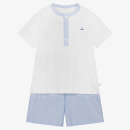 Aqua blue and white pyjamas for boys by Laranjinha, with a super soft cotton jersey T-shirt. A bedtime essential, this cosy shorts set includes a short-sleeved T-shirt with a blue gingham trim on the neckline and button placket. There is a small whale motif embroidered on the chest for a fun finish. In a lightweight weave, the matching shorts come in a coordinating gingham pattern to tie the two pieces together. They have an elasticated waistband for a comfortable night's sleep.