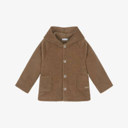 Pale grey hooded puffer jacket for younger boys by Laranjinha. Made in silky polyester, it is lightly padded and lined in warm, contrasting grey fleece. The brand's logo badge is on one cuff and the zip fastening has a useful zip guard.