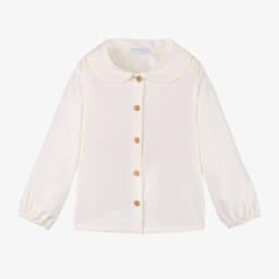 The ivory floral blouse for girls by Laranjinha is a charming addition to any wardrobe, featuring a delicate floral pattern on soft cotton fabric. This timeless blouse boasts a classic collar adorned with a pink ric rac ribbon and charming puffed sleeves. Elegant mother-of-pearl buttons add a touch of sophistication to the front fastening. Perfect for spring and summer outings, it is both lightweight and comfortable. Limited quantities available, so secure this beautiful piece today.