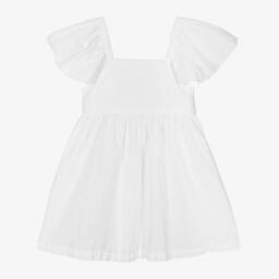 Beautifully cool and lightweight for warm days, this orange dress for girls is from Laranjinha. Made in a soft linen and cotton blend, it has delicate flutter sleeves and is gathered at the waist for a comfortable fit. A square neckline gives a stylish look and the dress fastens with branded mother-of-pearl buttons and a bow on the back.