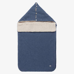 A sea blue nest for baby boys by Laranjinha, knitted in a merino wool, viscose and cashmere blend. This nest has a warm fleecy lining to keep your little one cosy and comforted. The mother-of-pearl button fastening hood and zip-up side allow the nest to open up.